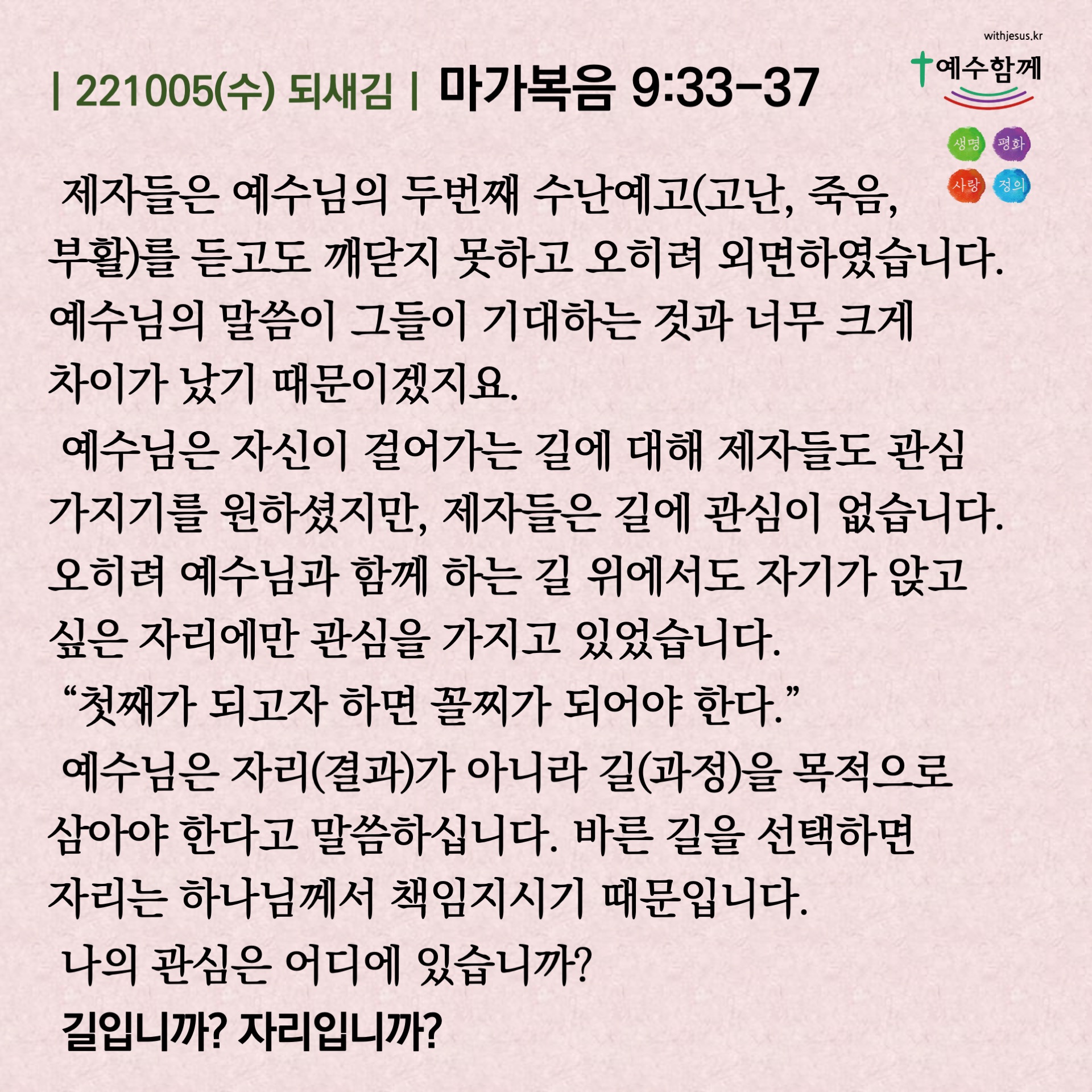 | [예수함께말씀 221004] 마가복음 9:30-32 (0) | 2022.10.03 |