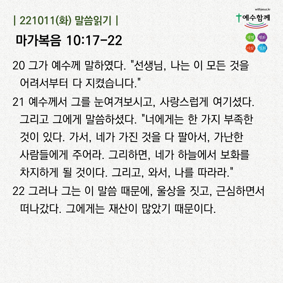 | [예수함께말씀 221012] 마가복음 10:23-31 (0) | 2022.10.11 |