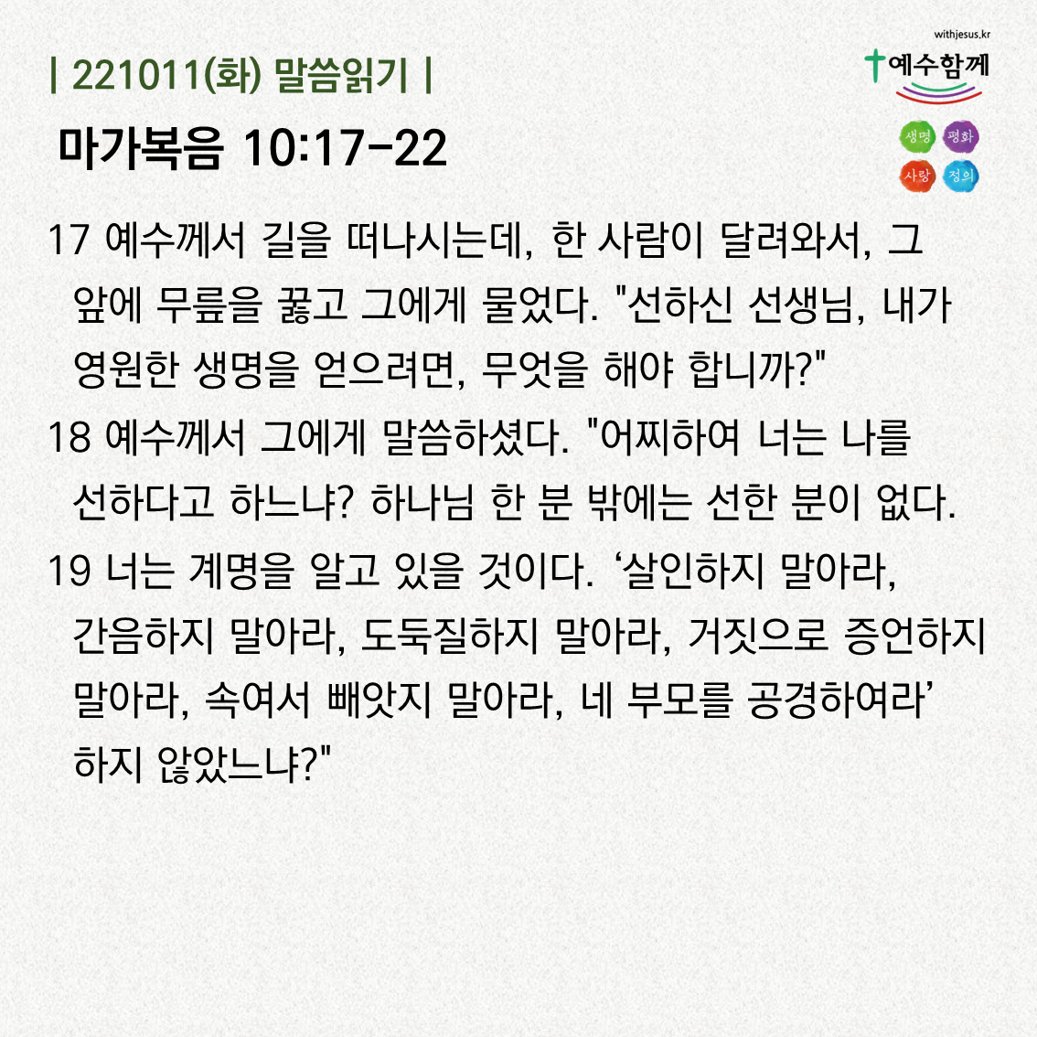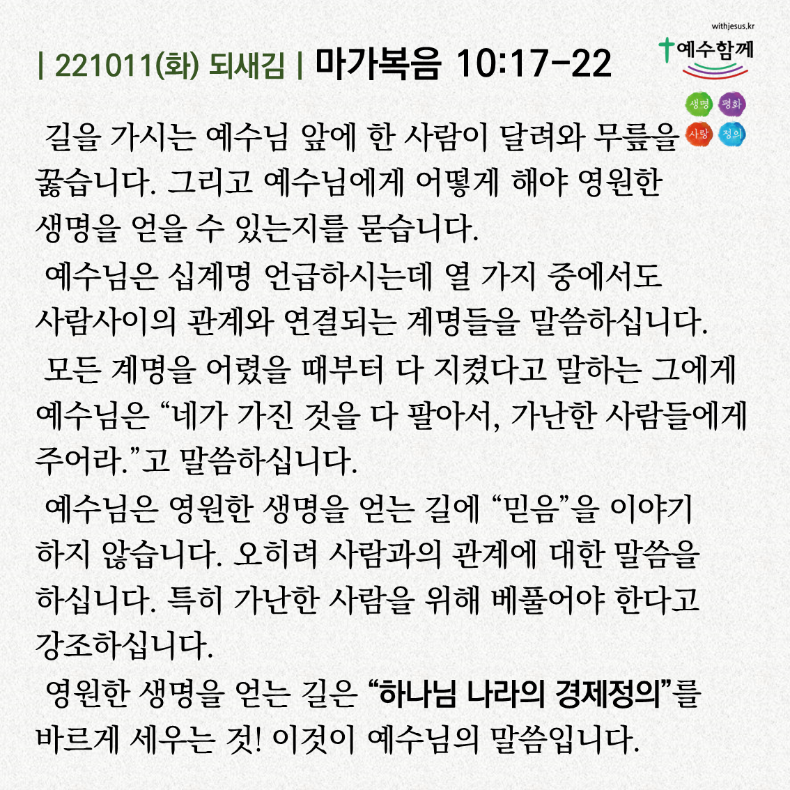 | [예수함께말씀 221012] 마가복음 10:23-31 (0) | 2022.10.11 |