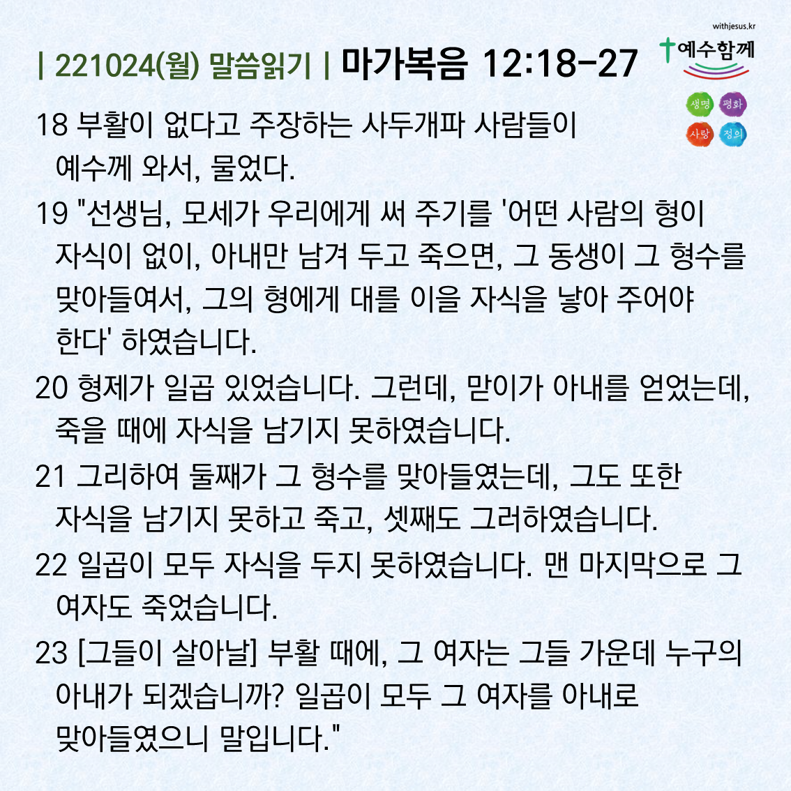 | [예수함께말씀 221021] 마가복음 12:1-12 (1) | 2022.10.20 |