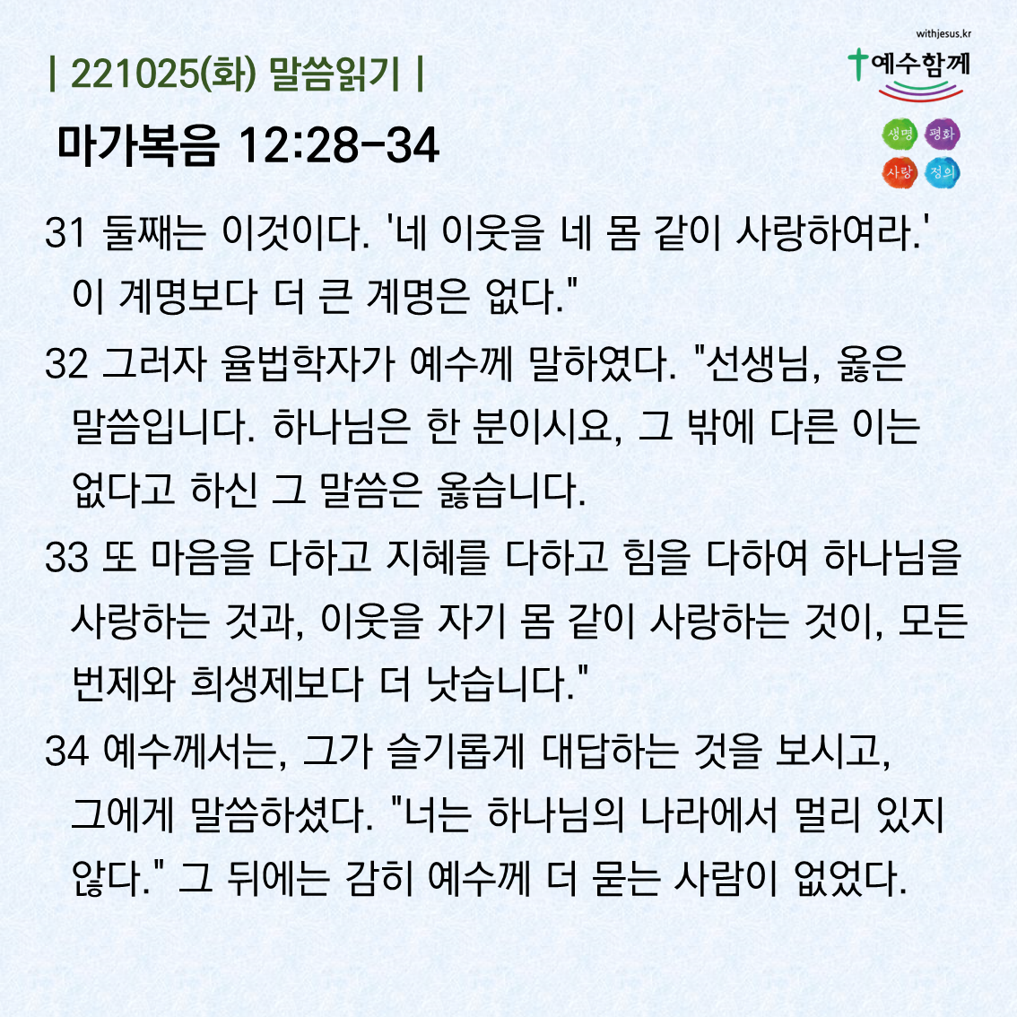 | [예수함께말씀 221026] 마가복음 12:35-40 (0) | 2022.10.25 |