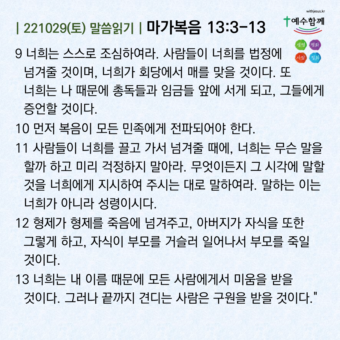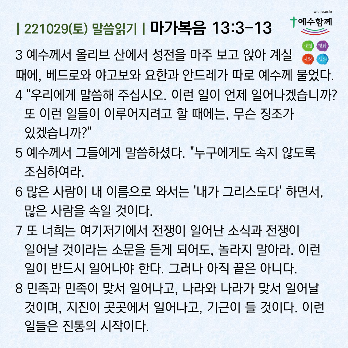 | [예수함께말씀 221101] 마가복음 13:24-31 (0) | 2022.10.31 |
