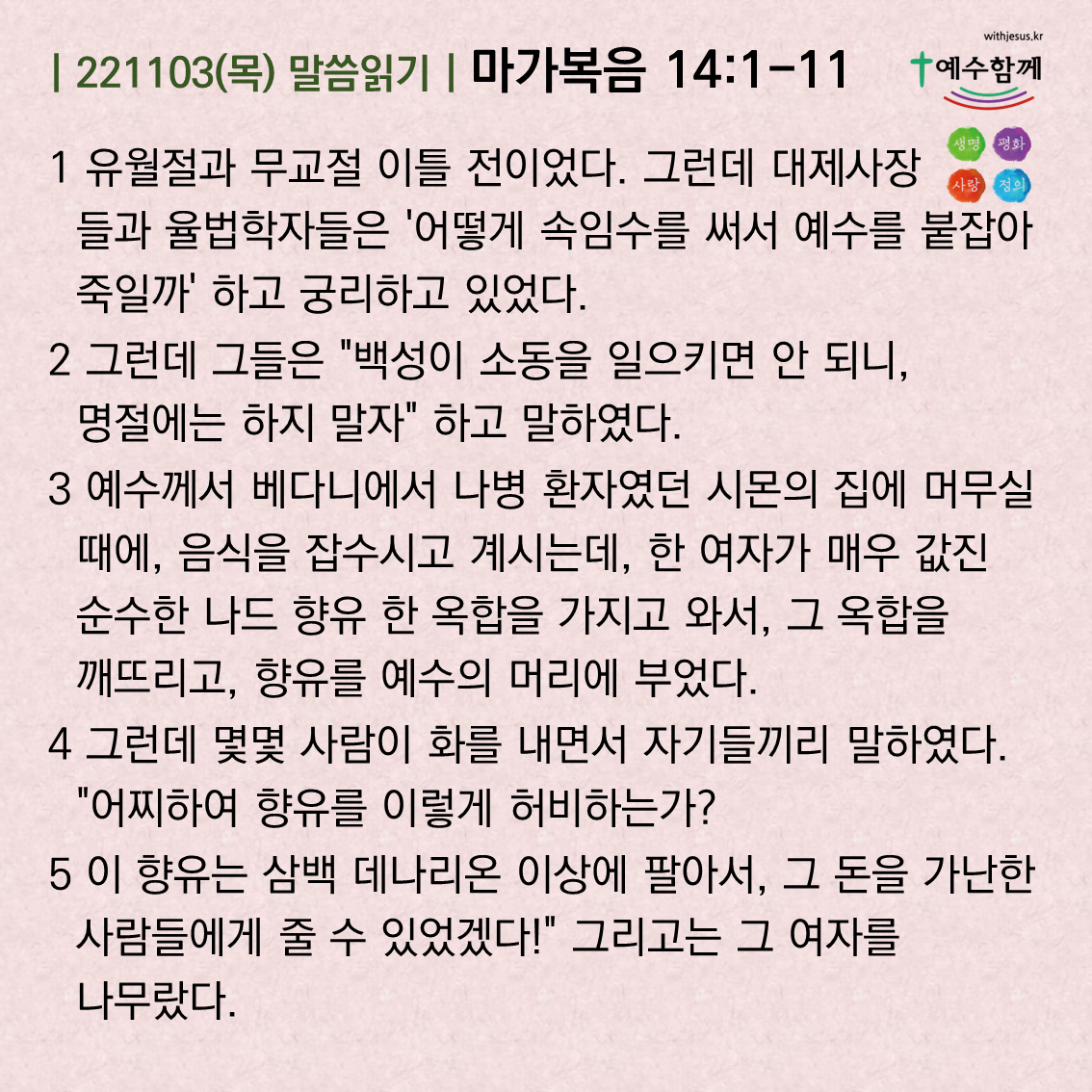 | [예수함께말씀 221104] 마가복음 14:12-21 (0) | 2022.11.03 |