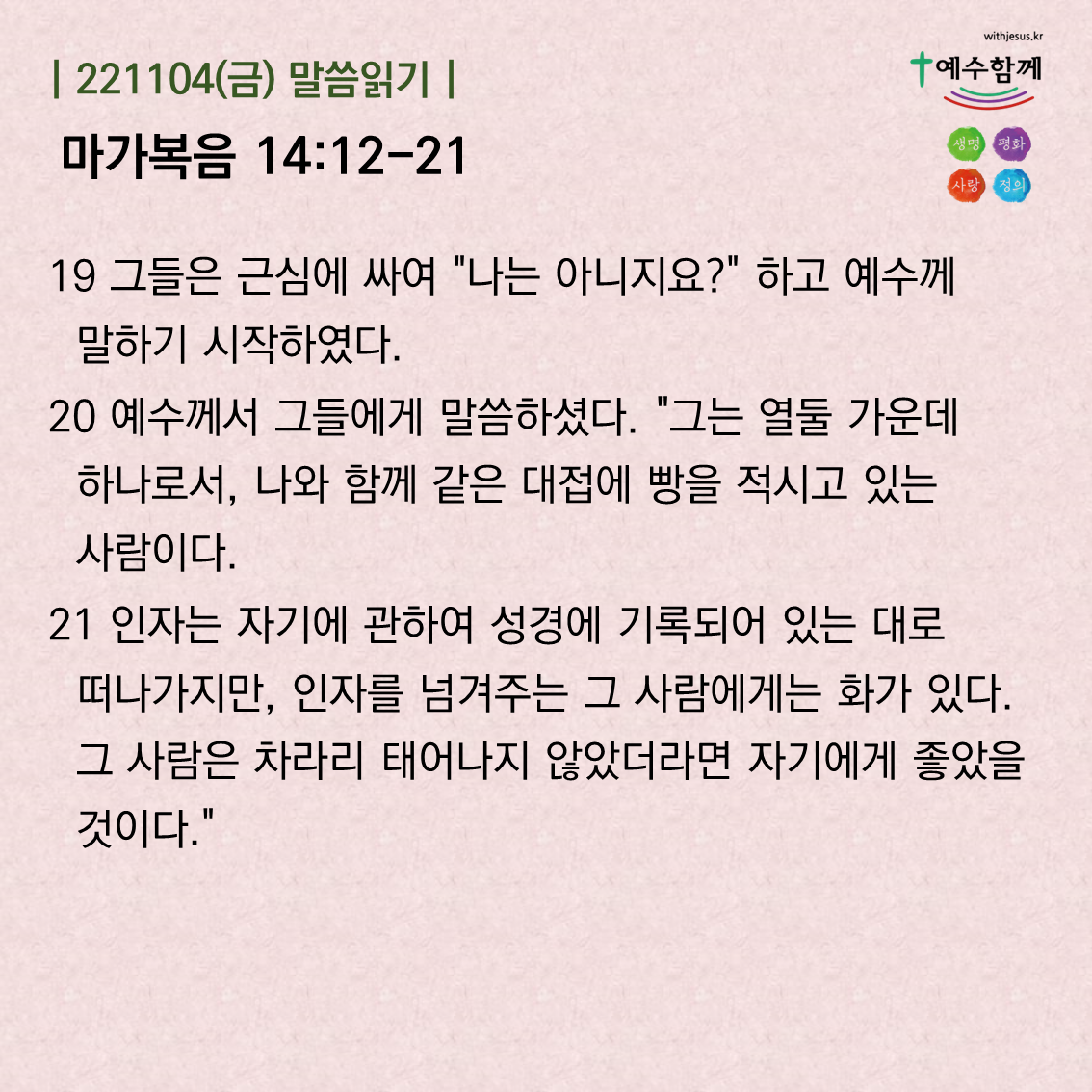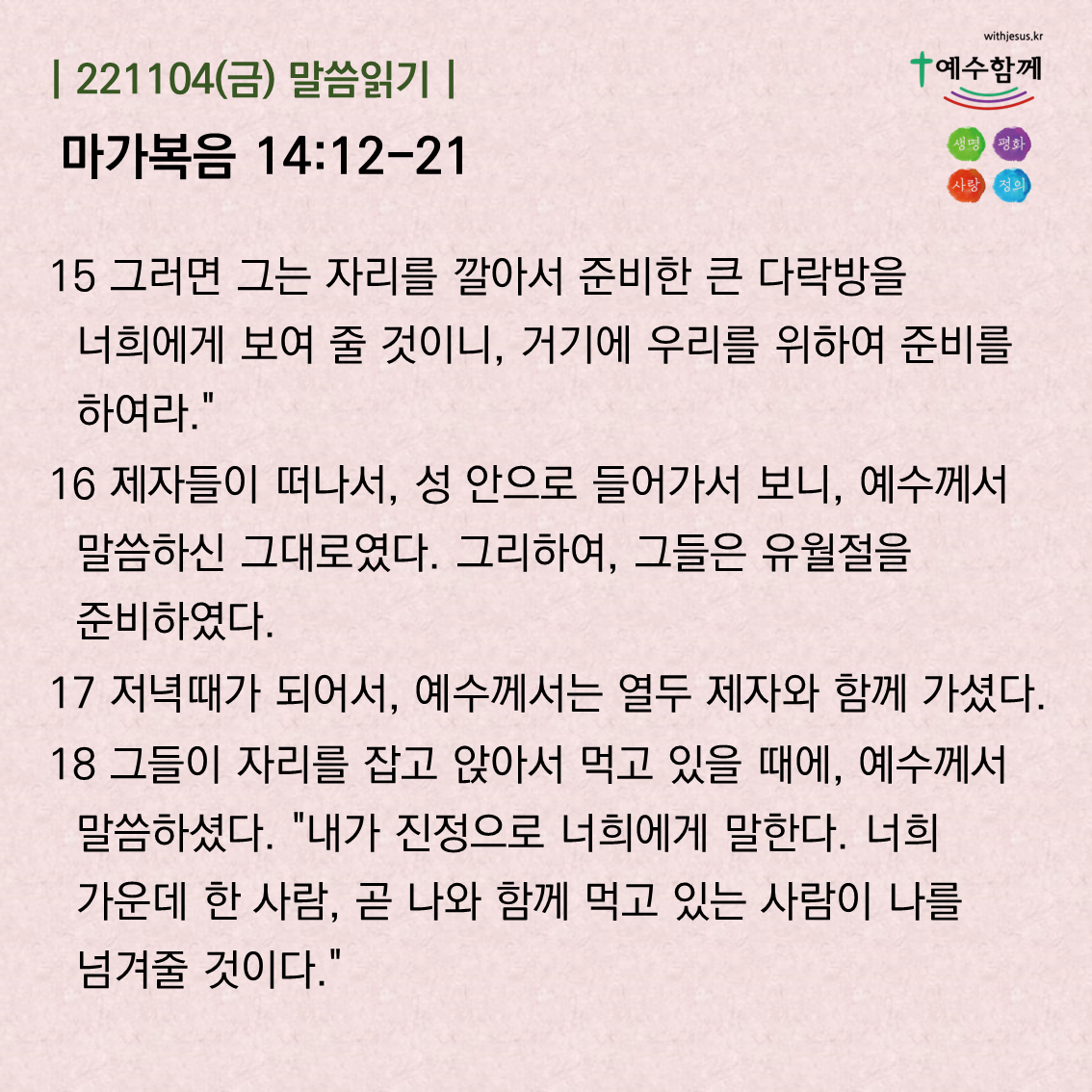 | [예수함께말씀 221105] 마가복음 14:22-26 (0) | 2022.11.05 |