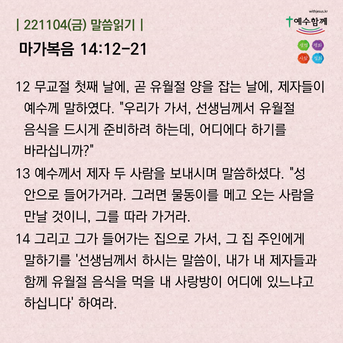 | [예수함께말씀 221105] 마가복음 14:22-26 (0) | 2022.11.05 |
