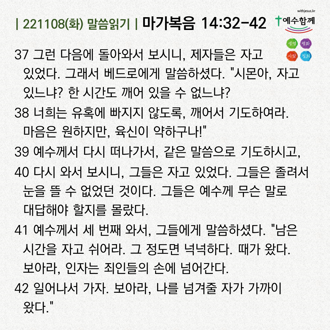 | [예수함께말씀 221109] 마가복음 14:43-52 (0) | 2022.11.08 |