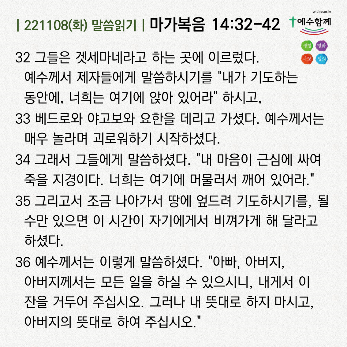 | [예수함께말씀 221105] 마가복음 14:22-26 (0) | 2022.11.05 |