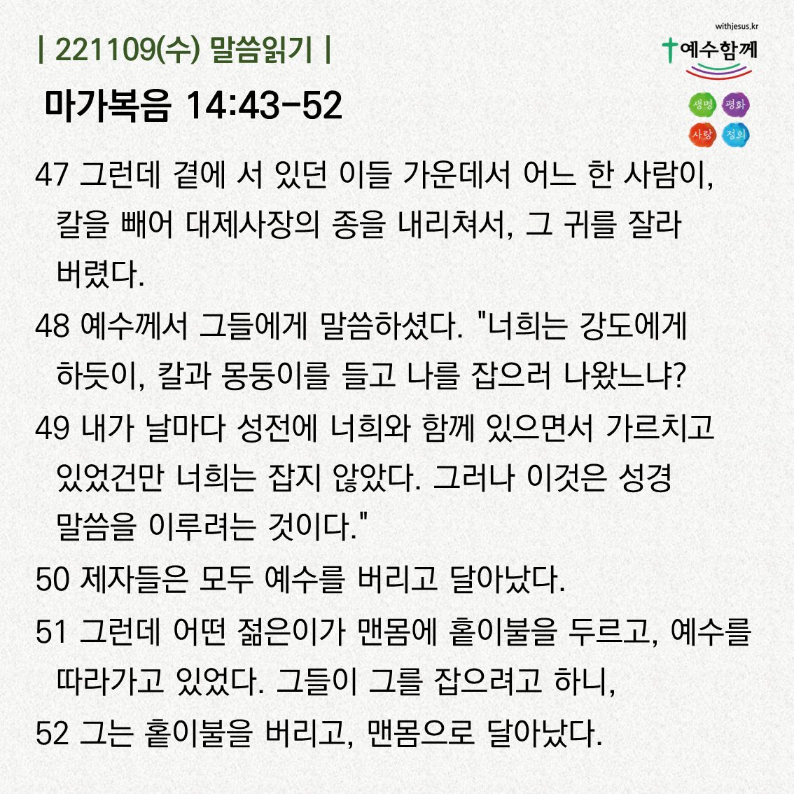 | [예수함께말씀 221110] 마가복음 14:53-65 (0) | 2022.11.09 |