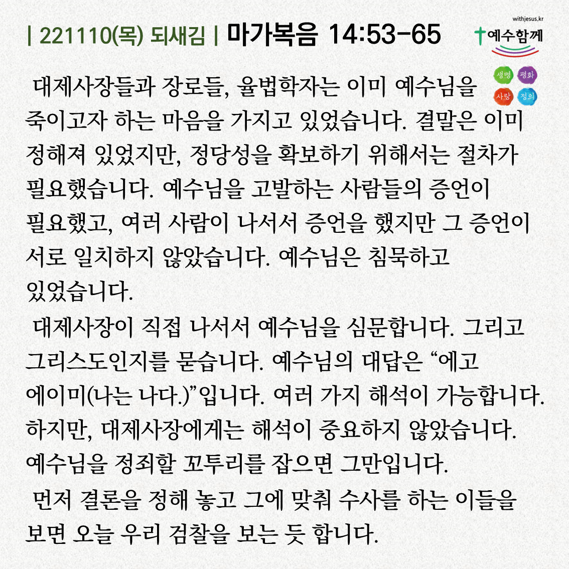 | [예수함께말씀 221111] 마가복음 14:66-72 (0) | 2022.11.10 |