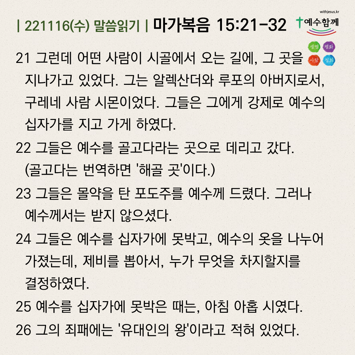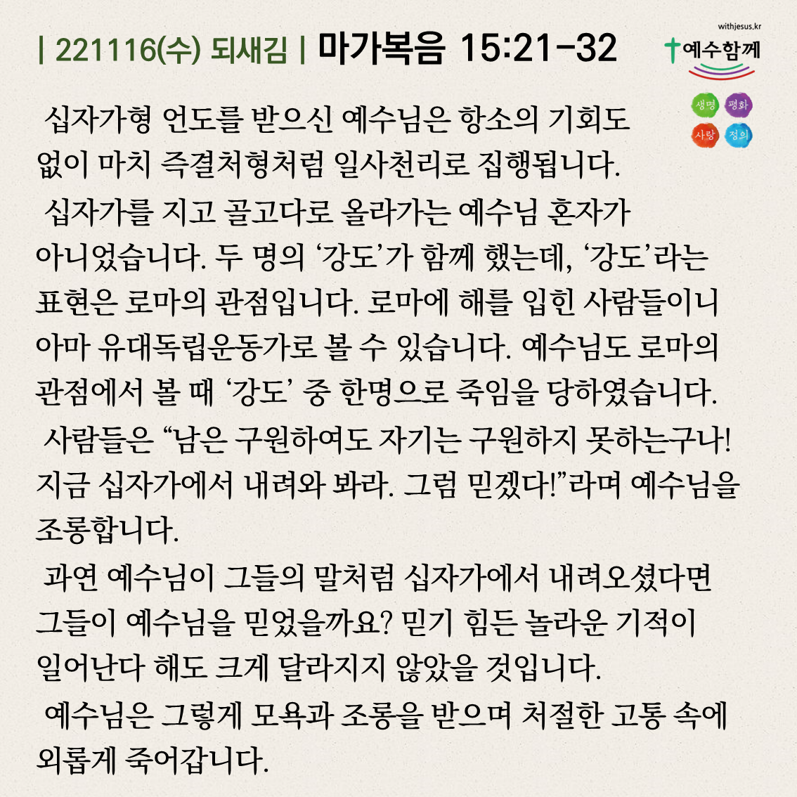 | [예수함께말씀 221117] 마가복음 15:33-41 (0) | 2022.11.16 |