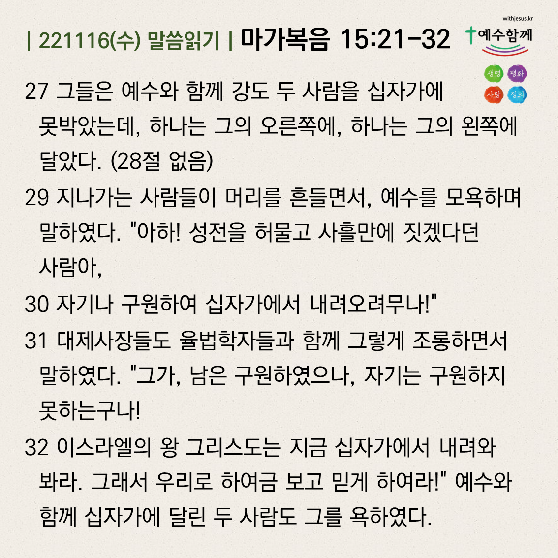 | [예수함께말씀 221117] 마가복음 15:33-41 (0) | 2022.11.16 |