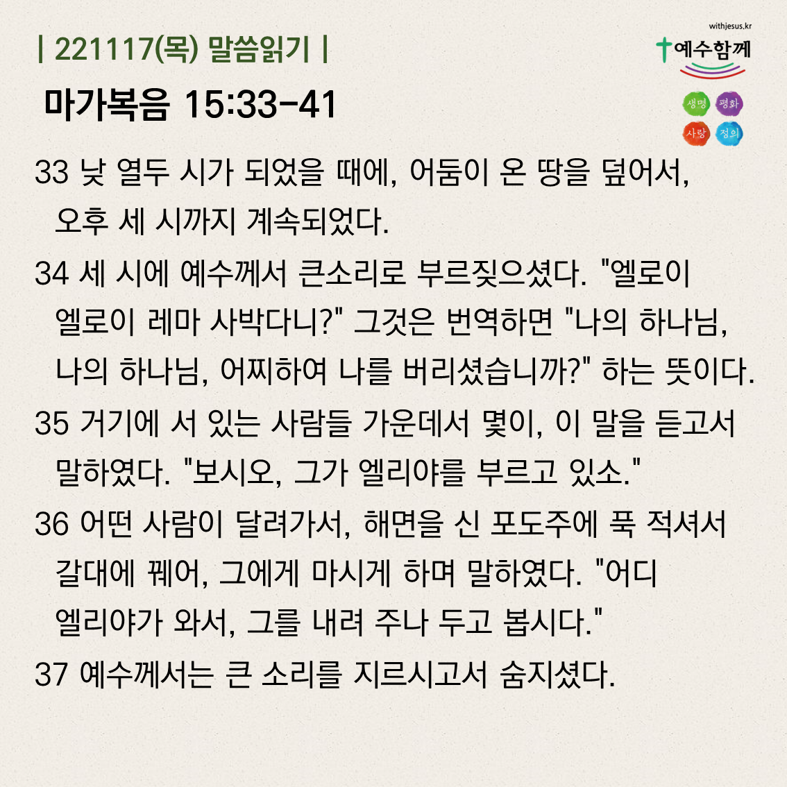 | [예수함께말씀 221116] 마가복음 15:21-32 (1) | 2022.11.15 |