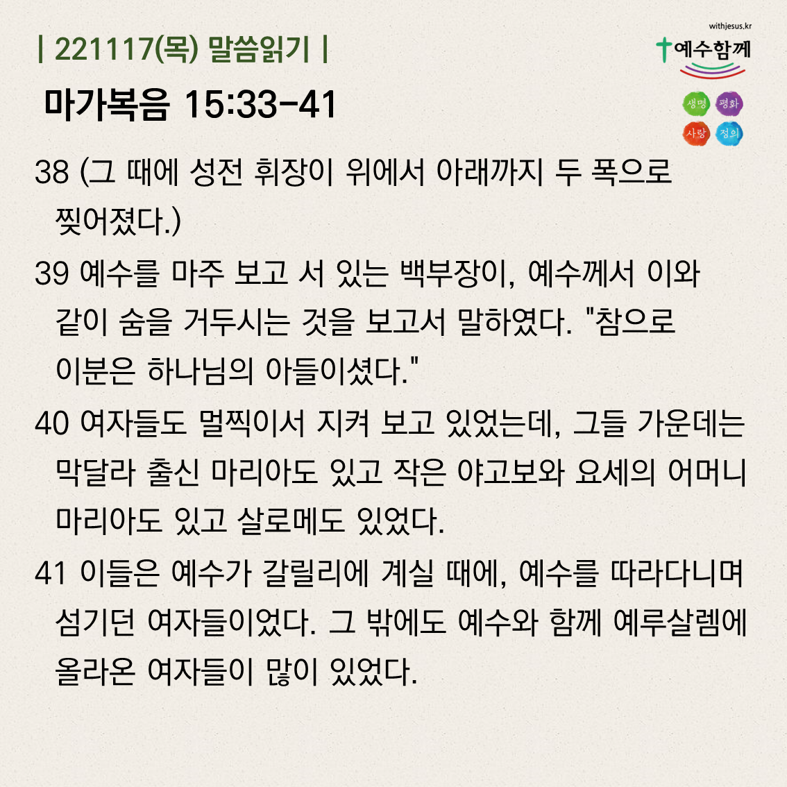 | [예수함께말씀 221116] 마가복음 15:21-32 (1) | 2022.11.15 |