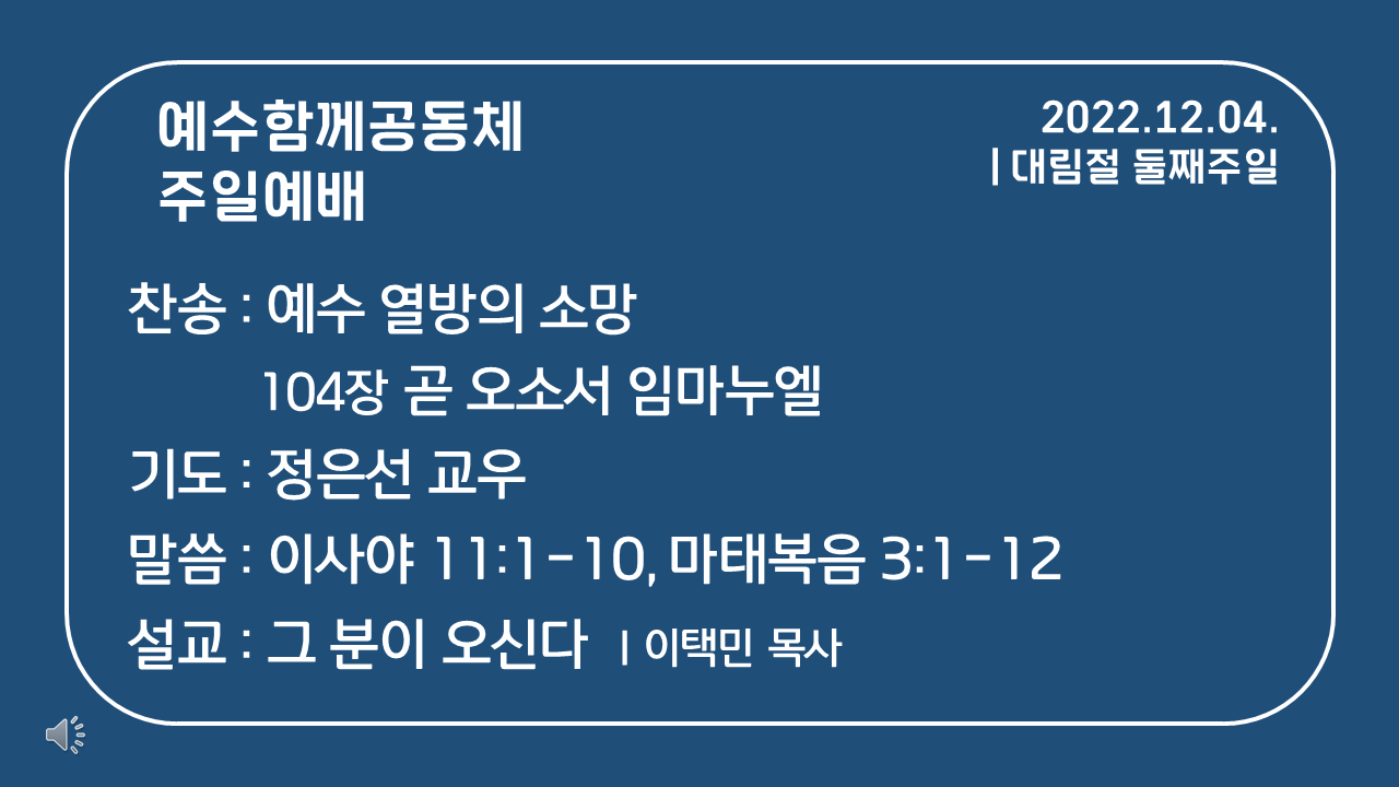 | 2022년 11월 27일 예수함께 주일예배 자료 (0) | 2022.11.26 |