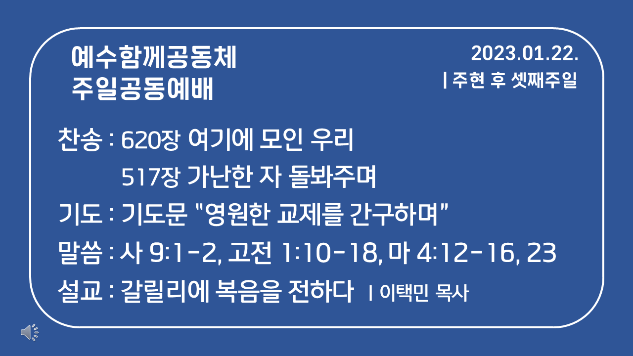 | [주일공동예배] 2023년 1월 29일 (0) | 2023.01.28 |