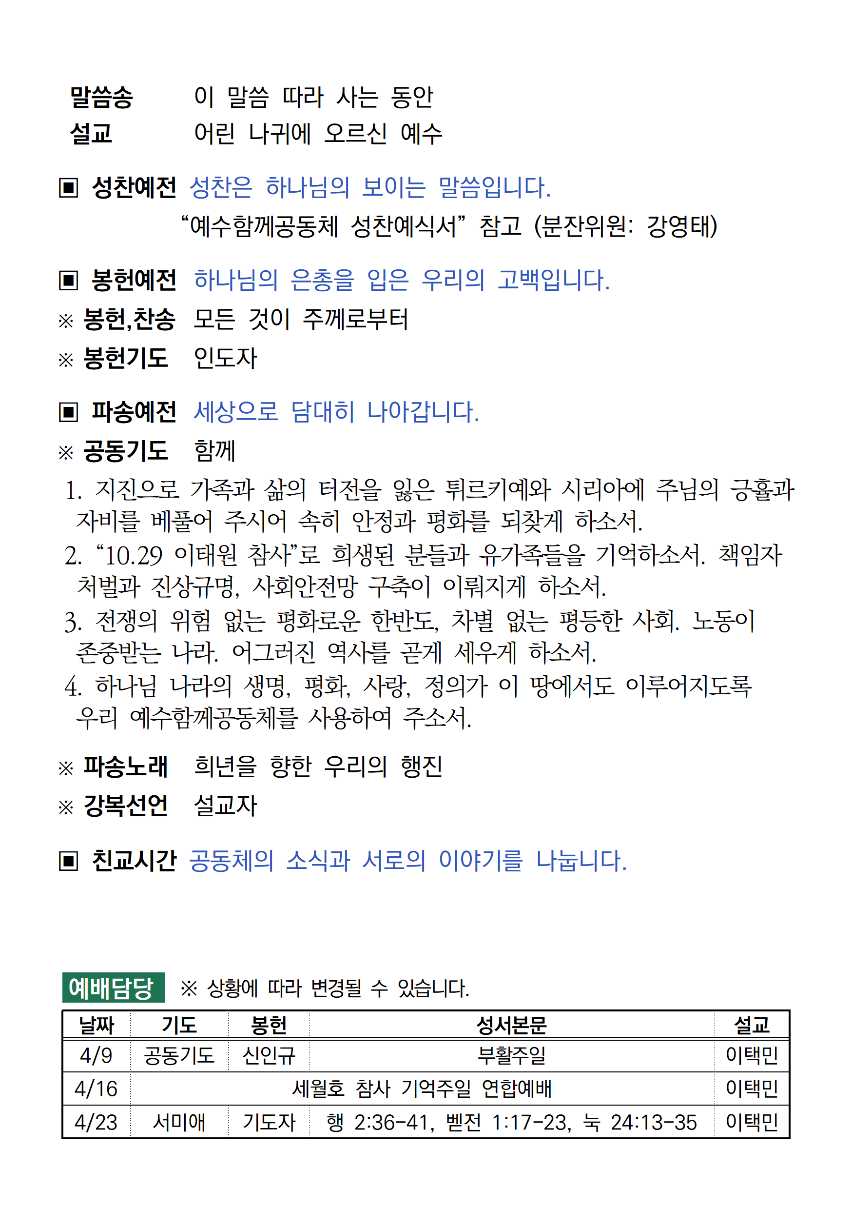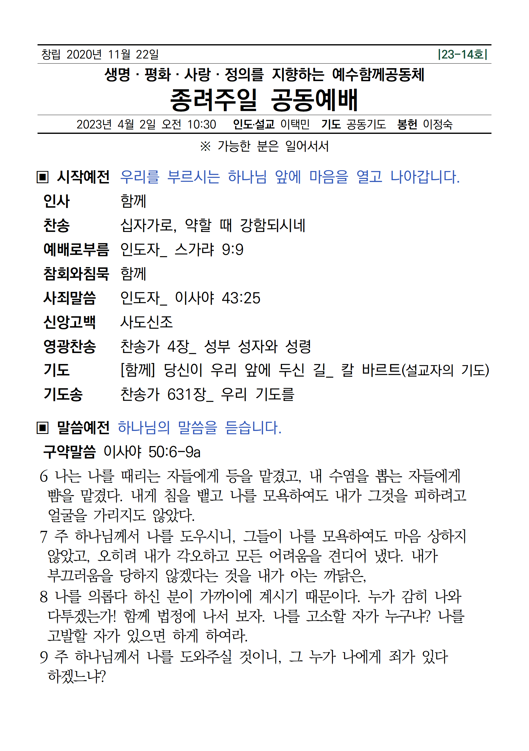 | [주보] 2023년 4월 9일 예수함께공동체 (0) | 2023.04.07 |