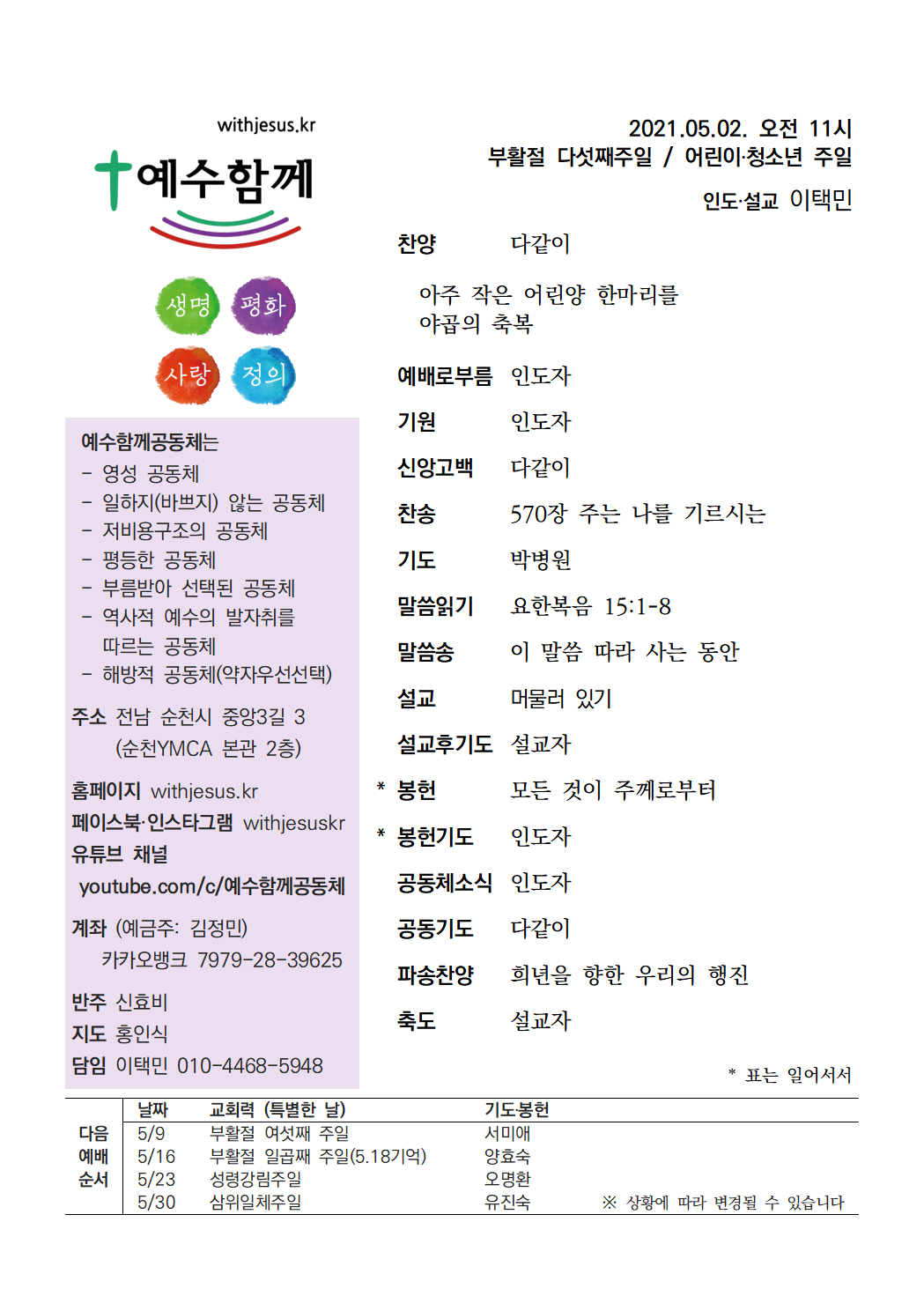 | 2021년 5월 9일 예수함께 주일예배 자료 (0) | 2021.05.08 |