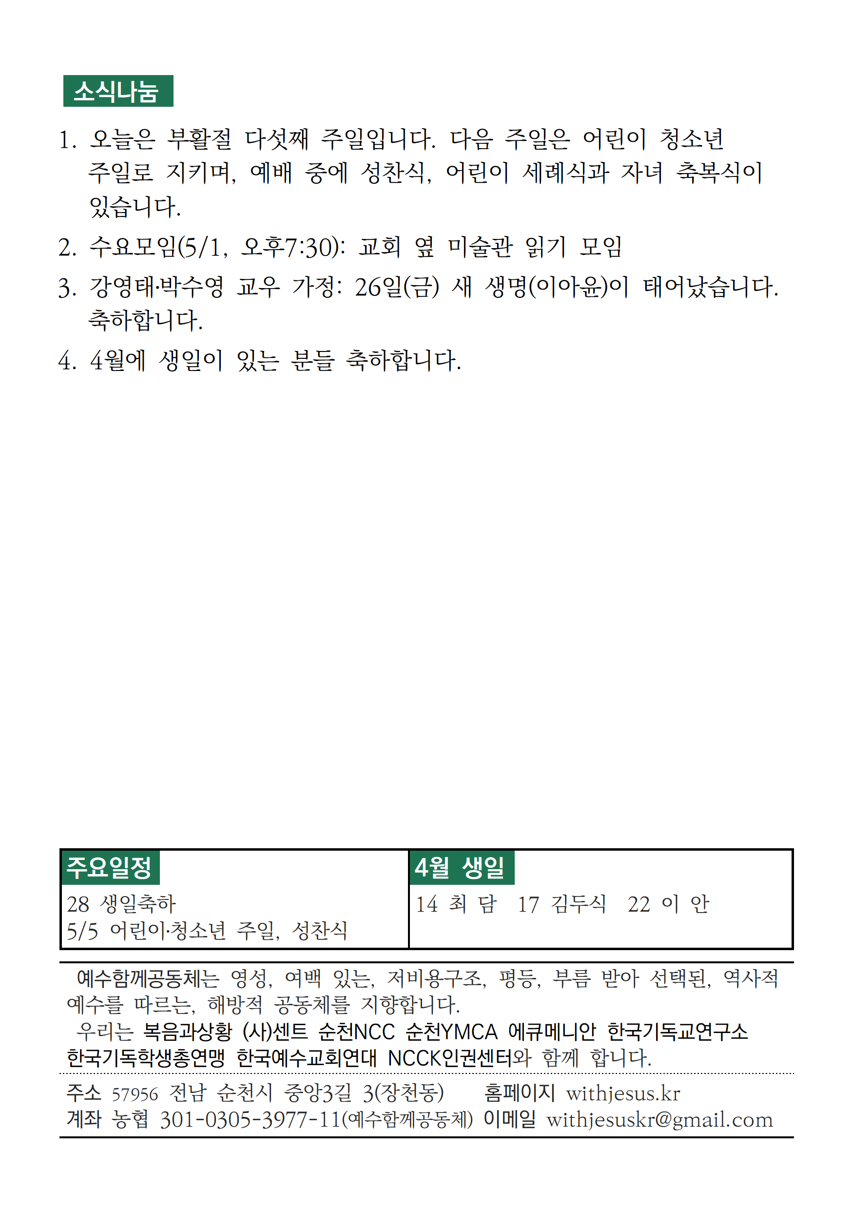 예수함께 예배 [주보] 2024년 4월 28일 예수함께공동체 withjesus 2024. 4. 27. 14:06 이전다음 0123 * 주보파일 jubo_24_17.pdf 0.12MB *찬양파일 music_20240428.pdf 0.16MB