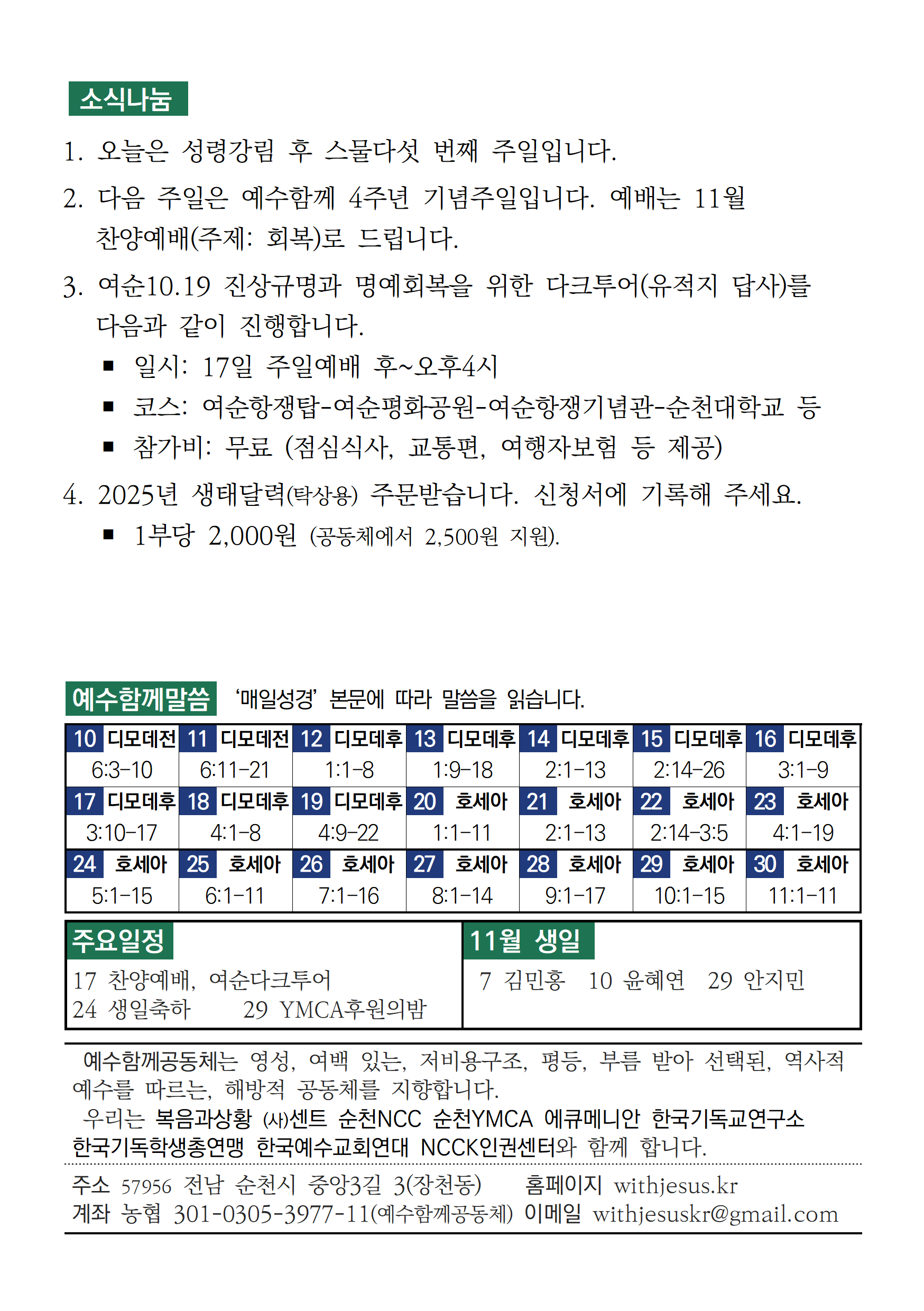 예수함께 예배 [주보, 악보] 2024년 11월 10일 예수함께공동체 withjesus 2024. 11. 9. 16:53 이전다음 0123 * 주보pdf jubo_24_45.pdf 0.26MB * 악보 pdf music_20241110.pdf 0.14MB