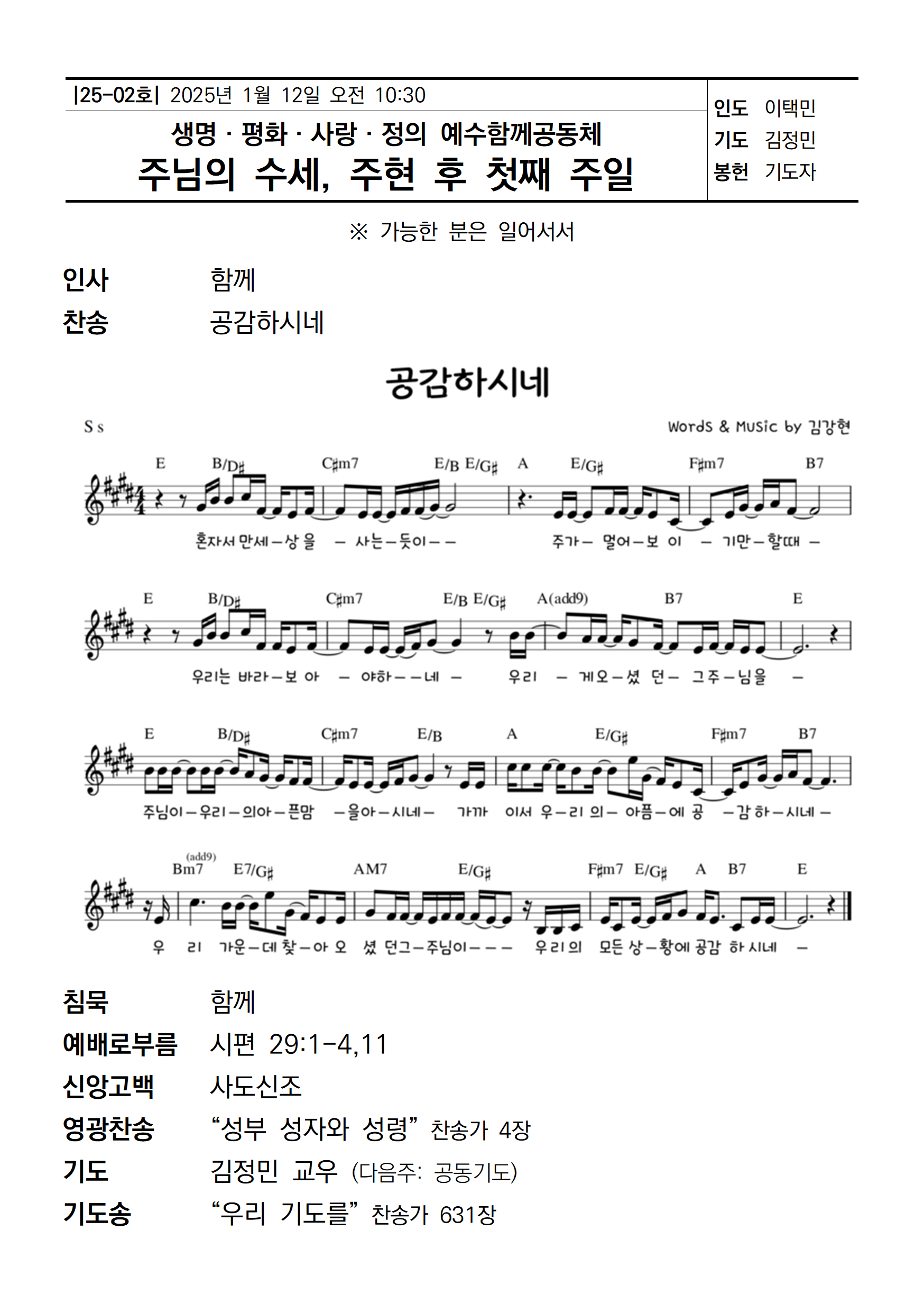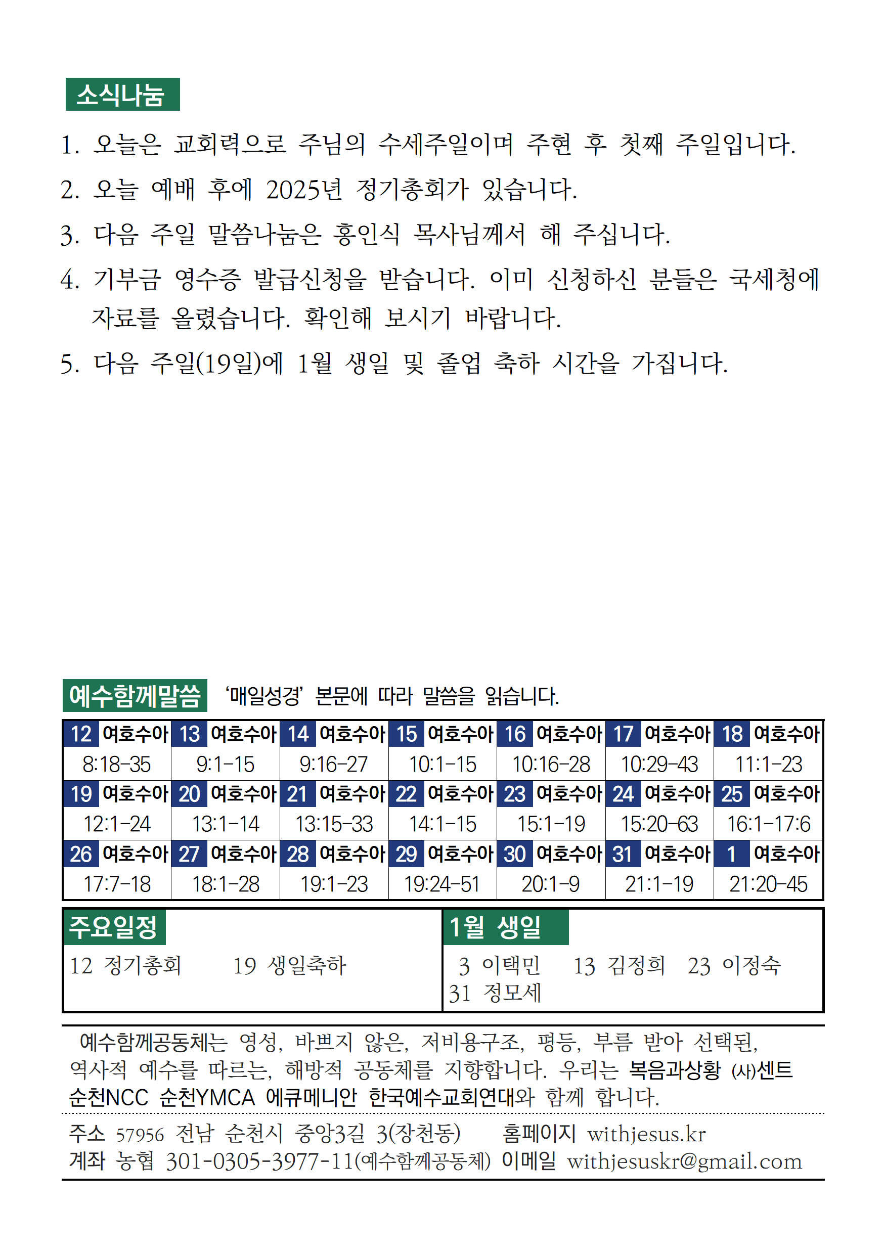 예수함께 예배 [주보] 2025년 1월 12일 예수함께공동체 withjesus 2025. 1. 11. 21:50 이전다음 0123 *주보pdf jubo_25_02.pdf 0.16MB
