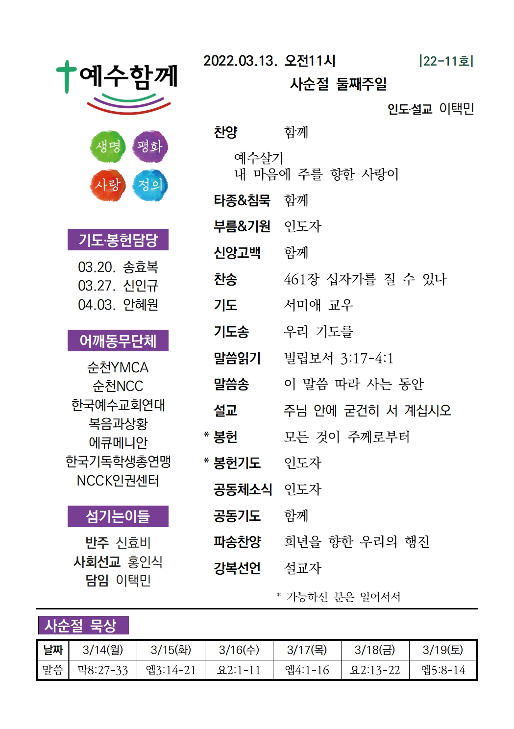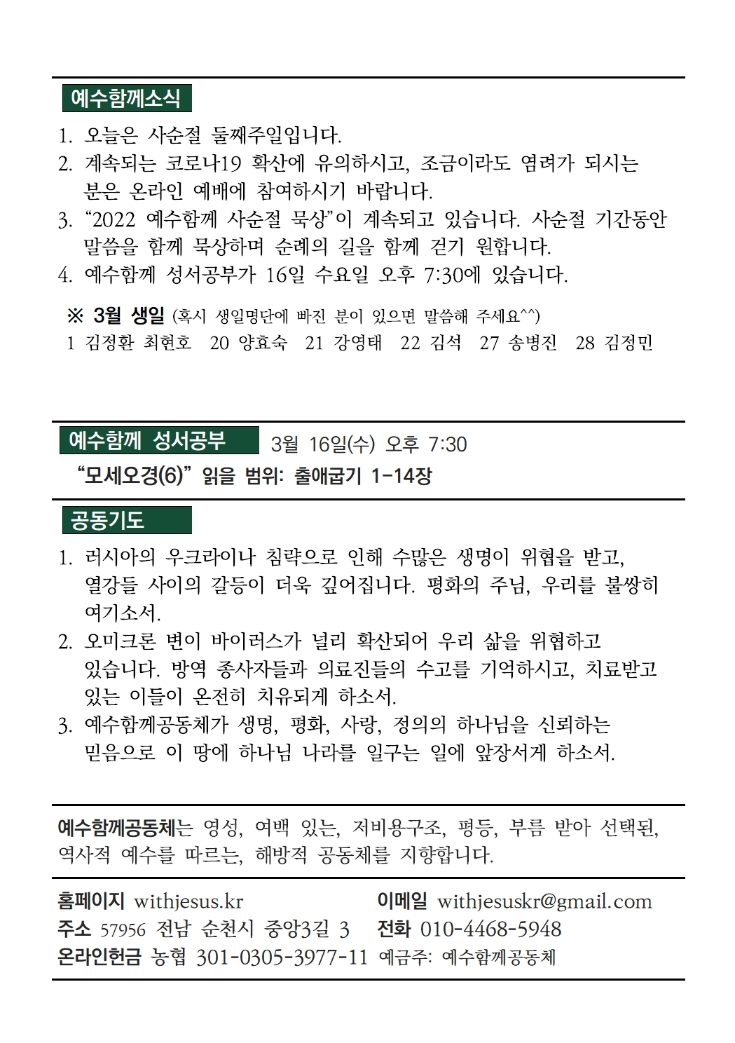 예수함께 예배 2022년 3월 13일 예수함께 주일예배 자료 withjesus 2022. 3. 12. 19:47 1. 예배찬양 music_20220313.pdf 0.30MB 2. 예배PPT service_20220313.pptx 2.86MB 3. 예배순서지