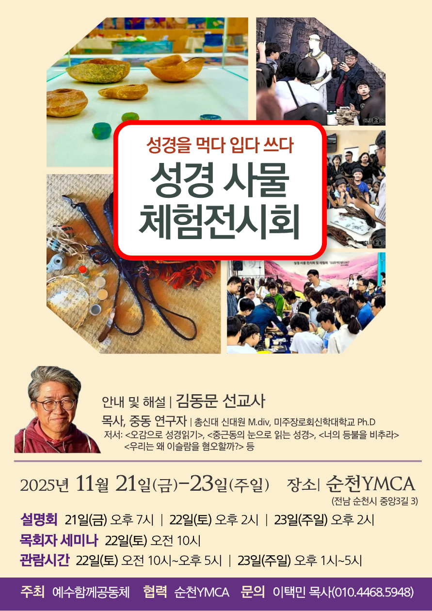성경에 나오는 물품들을 직접 맛보고 느끼는 체험전이 순천에서 열립니다.