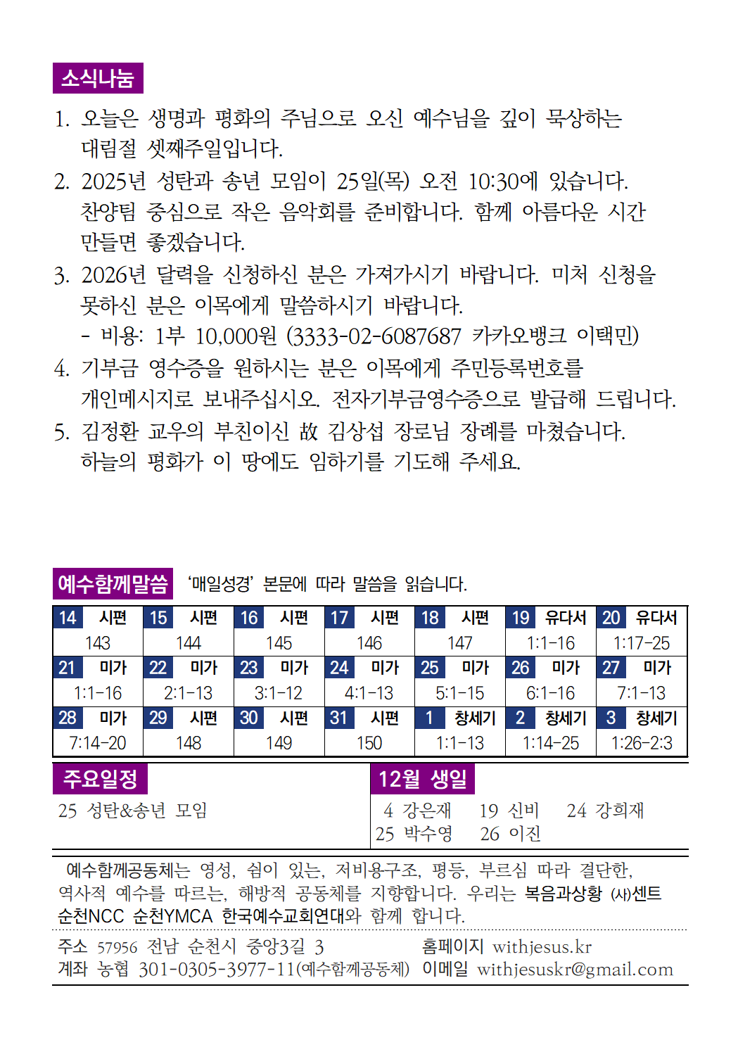 예수함께 예배 [주보] 2025년 12월 14일 예수함께공동체 withjesus 2025. 12. 13. 13:09 이전다음 0123 * 주보 파일 jubo_25_50.pdf 0.36MB