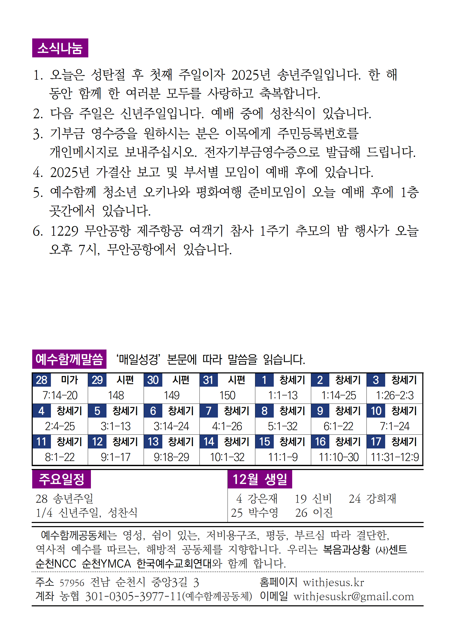 예수함께 예배 [주보] 2025년 12월 28일 예수함께공동체 withjesus 2025. 12. 27. 19:17 이전다음 0123 * 주보 파일 jubo_25_52.pdf 0.22MB
