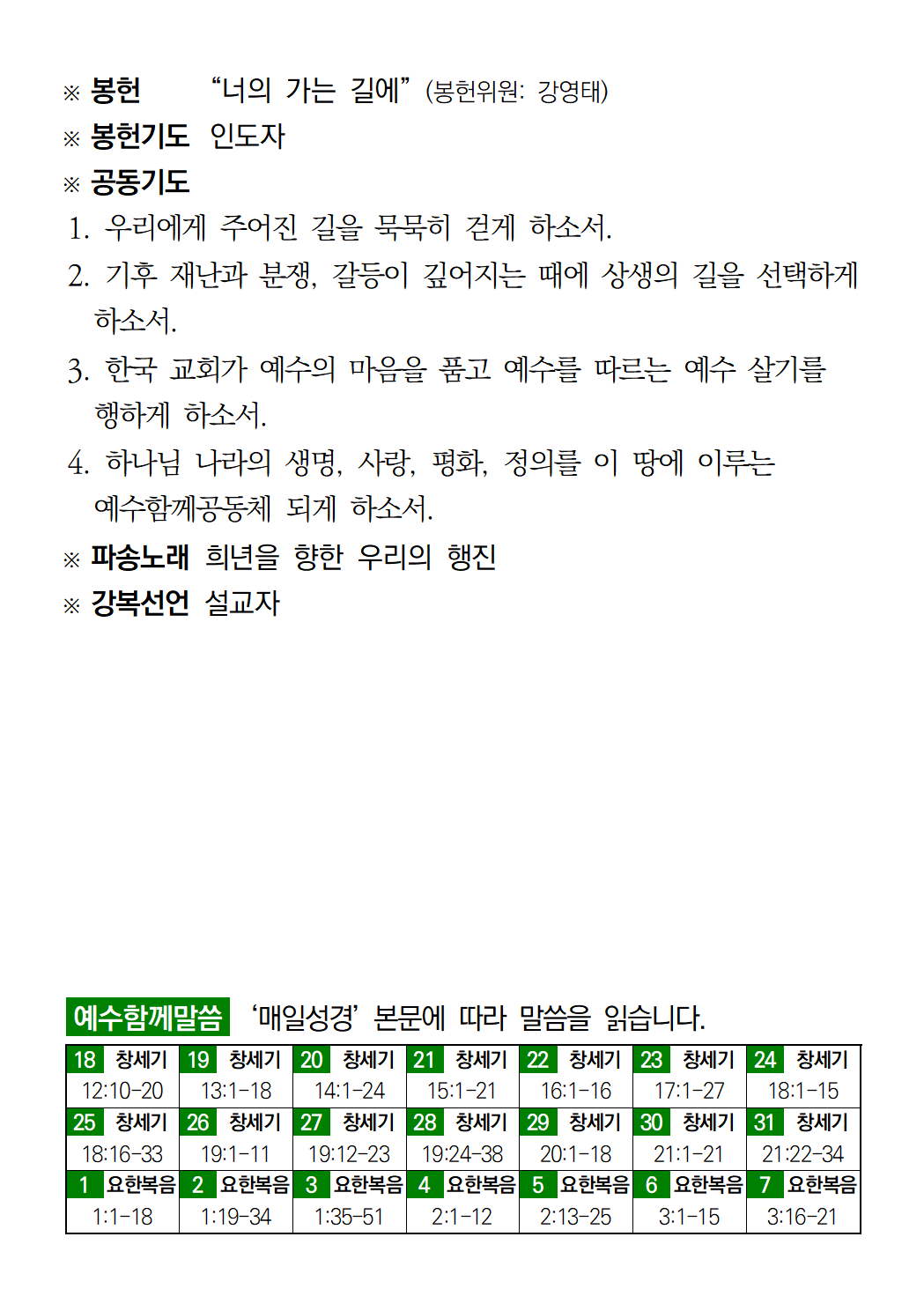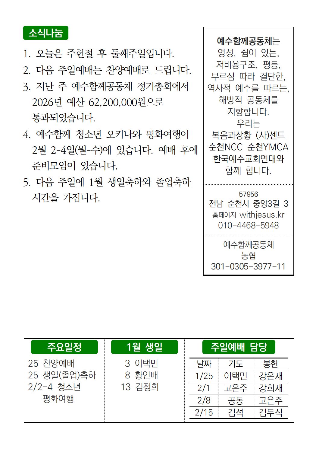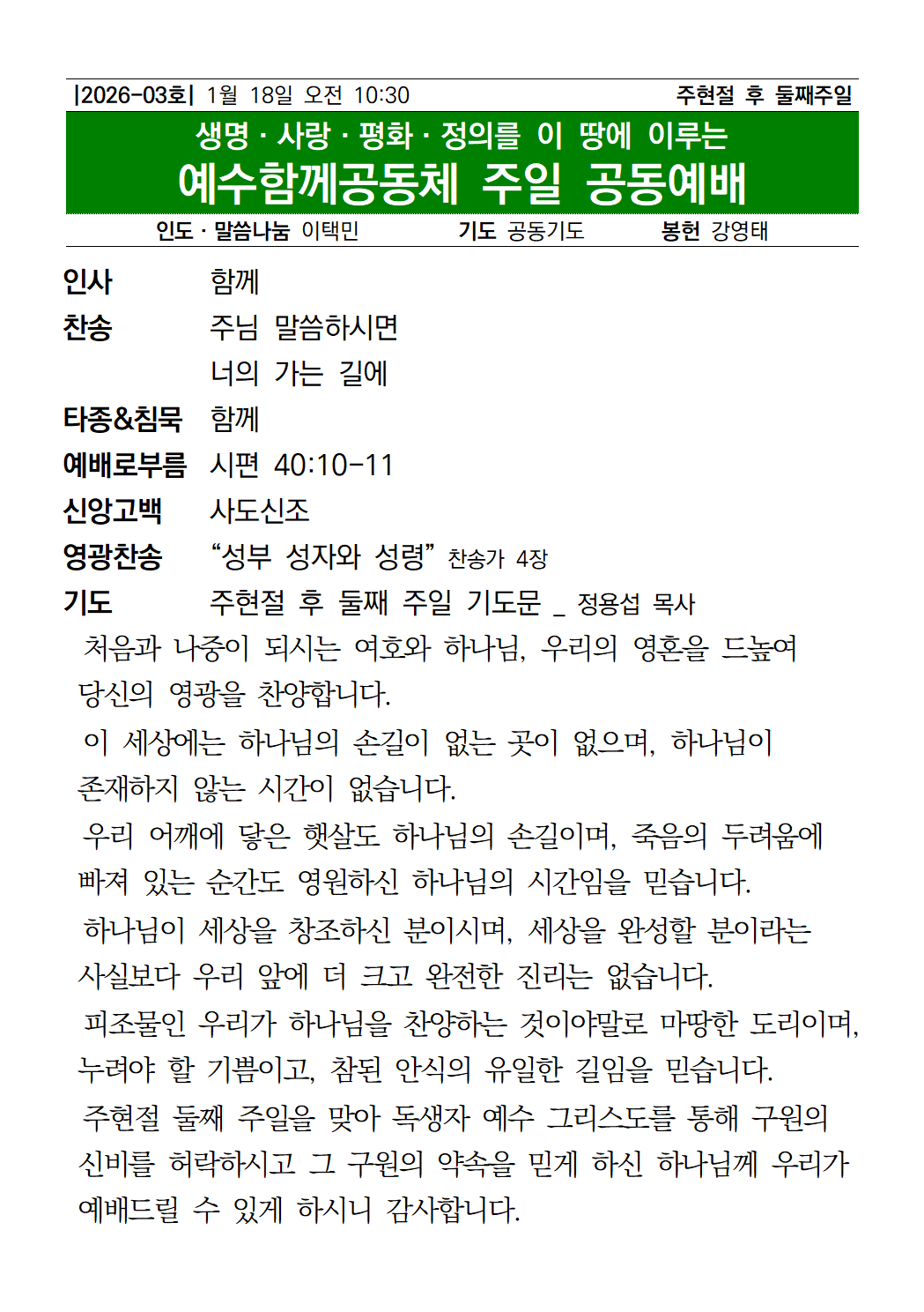 예수함께 예배 [주보, 악보] 2026년 1월 18일 예수함께공동체 withjesus 2026. 1. 17. 13:01 이전다음 0123 * 주보파일 jubo_26_03.pdf 0.12MB * 악보 music_20260118.pdf 0.31MB
