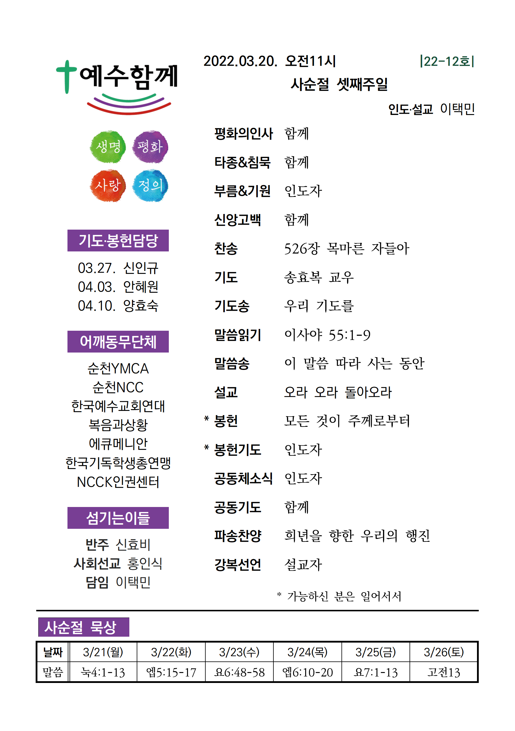 * 이번 주 예배는 온라인(ZOOM과 유튜브) 으로 진행합니다.