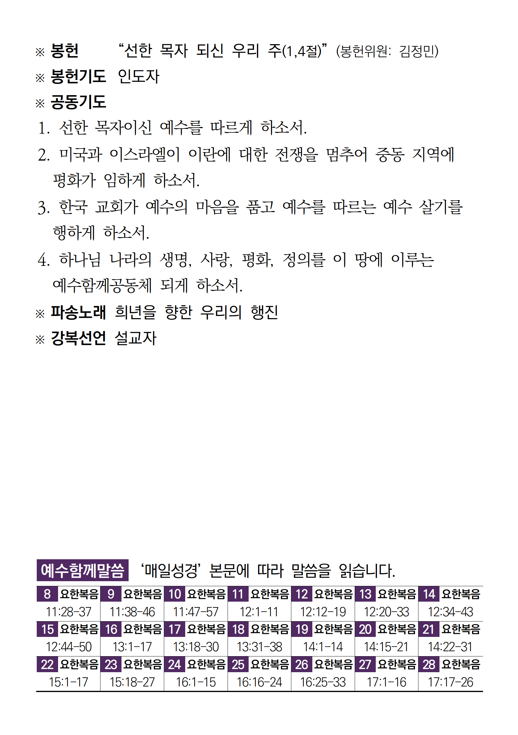 예수함께 예배 [주보, 악보] 2026년 3월 8일 예수함께공동체 withjesus 2026. 3. 7. 16:12 이전다음 012345 * 주보, 악보 파일 jubo_26_10.pdf 0.99MB